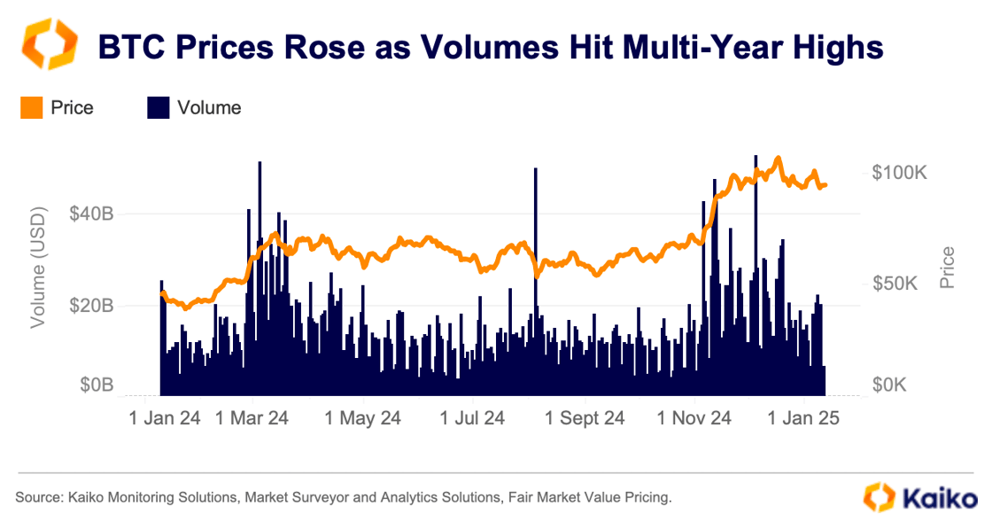 This all culminated in BTC crossing $100k for the first time in early December, peaking at $107k.