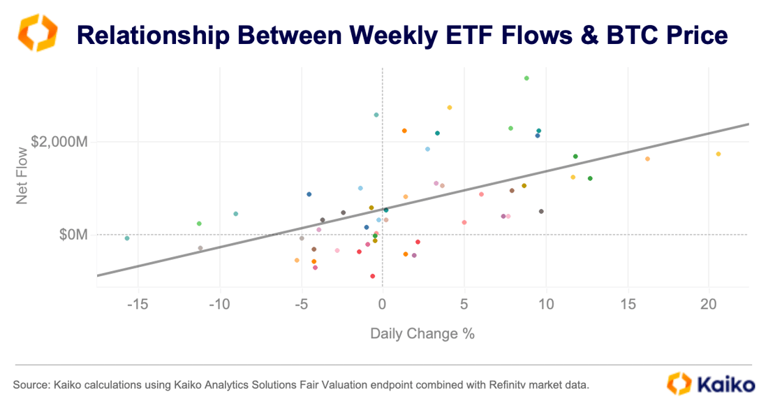 However, two examples don’t establish a clear trend. A closer look reveals that the relationship between on-chain net flows for US BTC Spot ETFs and daily BTC-USD price changes remains weak. Kaiko’s analysis shows an R-squared value of 0.32, while still quite low this does suggest some relationship between the two exists.