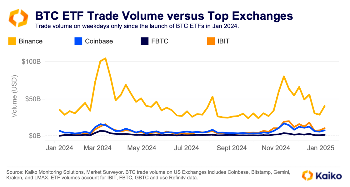 In just one year, the top three ETFs by AUM consistently outperformed major US crypto exchanges in volume, though not global leaders like Binance, which does three times the volume of these three funds.