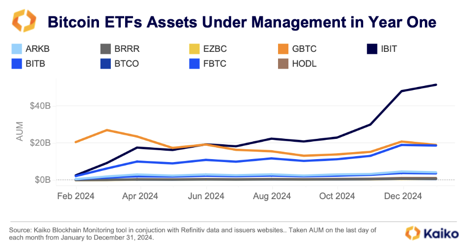 The headline figures and data suggest these funds had a significant impact on prices and the market overall. With $36bn in net flows during their first year, ETFs now manage around $110bn in assets. BlackRock’s IBIT stands out as one of the most successful launches ever, closing the year with over $50bn in assets under management.