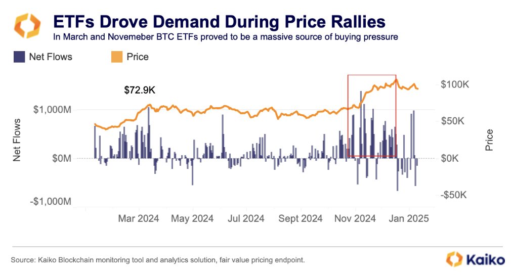 The market has come a long way since the SEC begrudgingly approved spot BTC ETFs last January. Over the past year, we’ve seen structural market changes, surging BTC demand, and record-breaking prices. The newly launched ETFs brought in over $36bn in net inflows in their first year, proving to be a reliable source of demand at key moments.