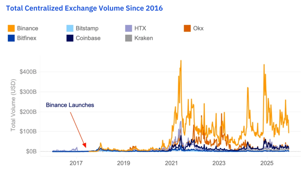 → Volumes climbed rapidly with Binance surpassing competitors by early 2018, following its July 2017 launch.