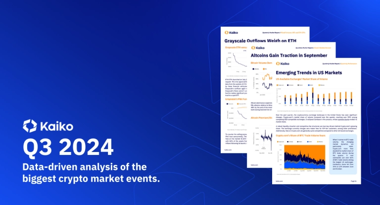 Quarterly Report: Q3 2024DownloadThe past few months in financial markets have been punctuated by short periods of volatility. In August, crypto prices plunged as traders grappled with shifting macroeconomic conditions around the globe. Despite the intermittent volatility and the typical lower volumes over the summer months, there were some bright spots. Altcoins gained traction towards the end of the quarter as liquidity conditions improved. Meanwhile, BTC ETFs’ trade volumes and inflows remained robust amid market uncertainty and large liquidations.