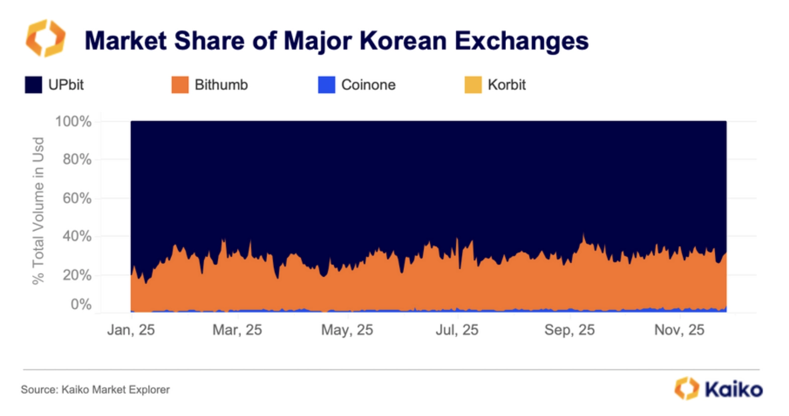 → The vast majority of trade volume in Korea is concentrated on UPbit, with recurring spikes far exceeding Bithumb, particularly during periods of macroeconomic shock.